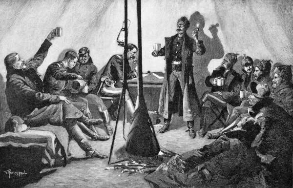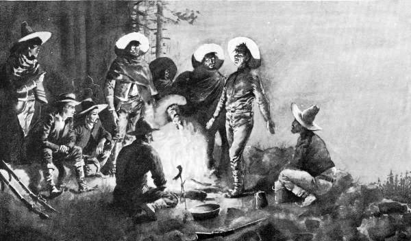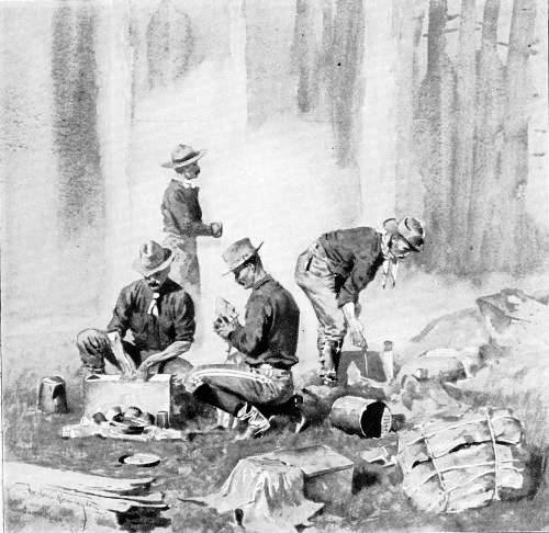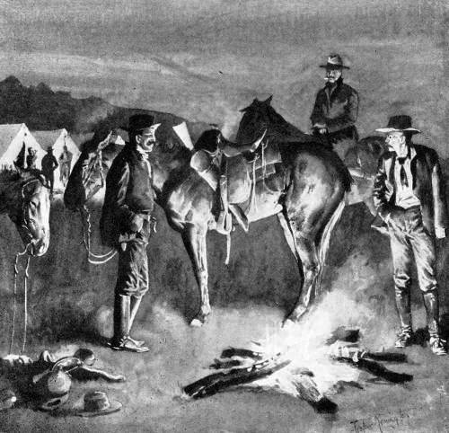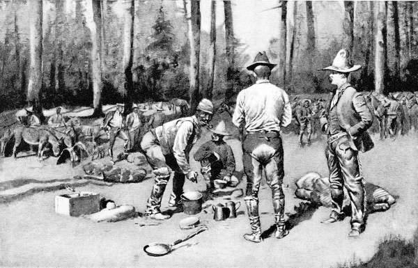 Riding over the rough mountains all day sows poppy[256]seeds in a man’s head, and when the big medical officer opens your tent-flaps in the morning, and fills the walls with his roars to “Get up! it’s four o’clock,” it is with groans that you obey. You also forego washing, because you are nearly frozen stiff, and you go out and stand around the fire with your companions, who are all cheerfully miserable as they shiver and chaff each other. It seems we do not live this life on a cold, calculating plane of existence, but on different lines, the variation of which is the chief delight of the discriminating, and I must record a distinct pleasure in elbowing fellows around a camp-fire when it is dark and cold and wet, and when you know that they are oftener in bed than out of it at such hours. You drink your quart of coffee, eat your slice of venison, and then regard your horse with some trepidation, since he is all of a tremble, has a hump on his back, and is evidently of a mind to “pitch.”