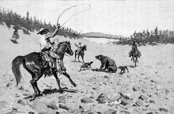 We were making our way down a bad formation when we heard the dogs, and presently three shots. A strayed cavalry orderly had, much to his disturbance of mind, beheld a big silver-tip bearing down on him, jaws skinned, ears back, and red-eyed, and he had promptly removed himself to a proper distance, where he dismounted. The bear and dogs were much exhausted, but the dogs swarmed around the bear, thus preventing a shot. But Bruin stopped at intervals to fight the dogs, and the soldier fired, but without effect. If men do not come up with the dogs in order to encourage them, many will draw off, since the work of chasing and fighting a bear without water for hours is very trying. Only hounds can be depended on, as the tongues of other dogs thicken, and they soon droop when long without water. Some[262] of the dogs may have followed the bear with cubs, but if they did we never heard of them. The one now running was an enormous silver-tip, and could not “tree.” The shots of the trooper diverted the bear, which now took off down a deep cañon next to the one we were in, and presently we heard him no more. After an hour’s weary travelling down the winding way we came out on the plain, and found a small cow outfit belonging to Mr. Stevens, and under a tree lay our dead silver-tip, while a half-dozen punchers squatted about it. It appeared that three of them had been working up in the foot-hills when they heard the dogs, and shortly discovered the bear. Having no guns, and being on fairly good ground, they coiled their riatas and prepared to do battle.