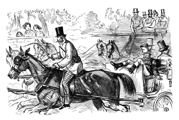 I may give another example—rare, no doubt—of Leech's having used a suggested subject. Many years ago my brother-in-law, long since dead, took a party of friends to the Derby. They drove, or, rather, were driven, down to Epsom, the usual post-boy being recommended as a careful, steady driver—a character very desirable, considering the crowded state of the road, more especially on the return journey. The post-boy quite realized all that was said of him as the party went to the course, but when the time came for departure he was found, after considerable searching, to be as nearly dead-drunk as possible. What was to be done? The man could scarcely stand; his driving was, of course, out of the question.