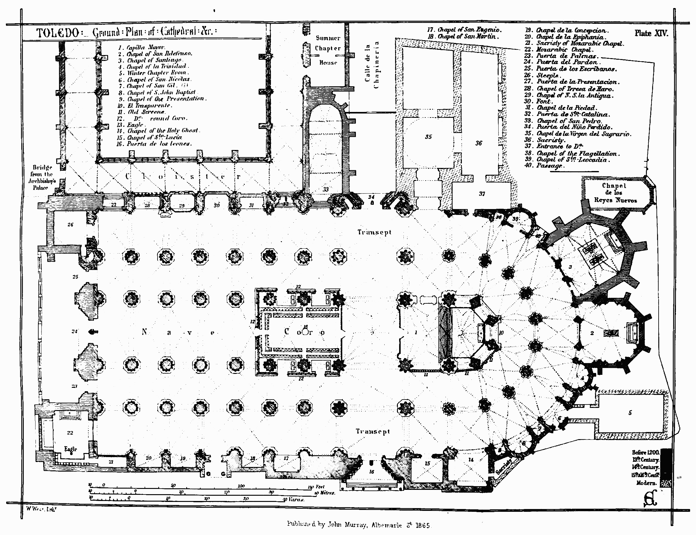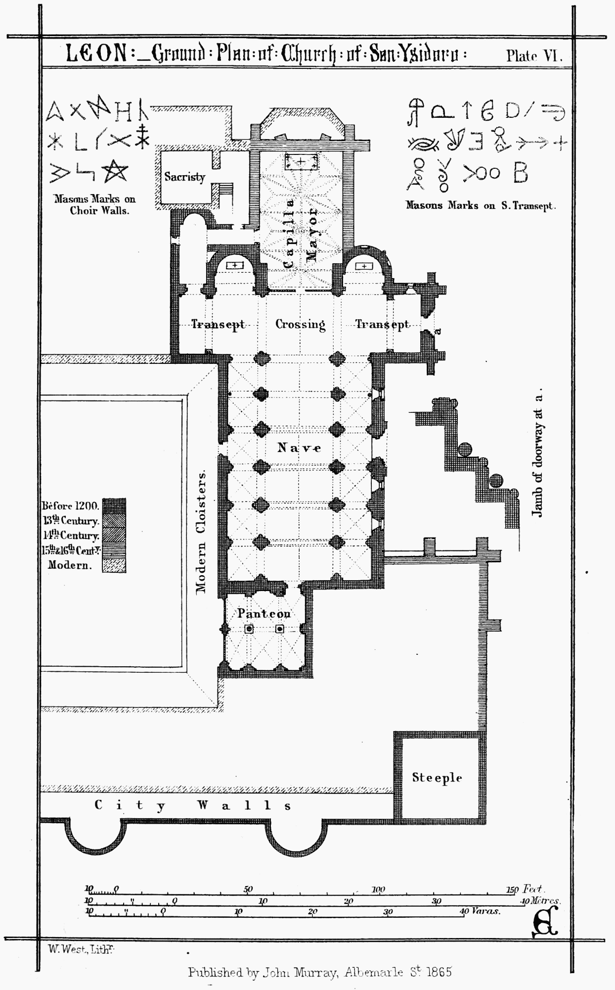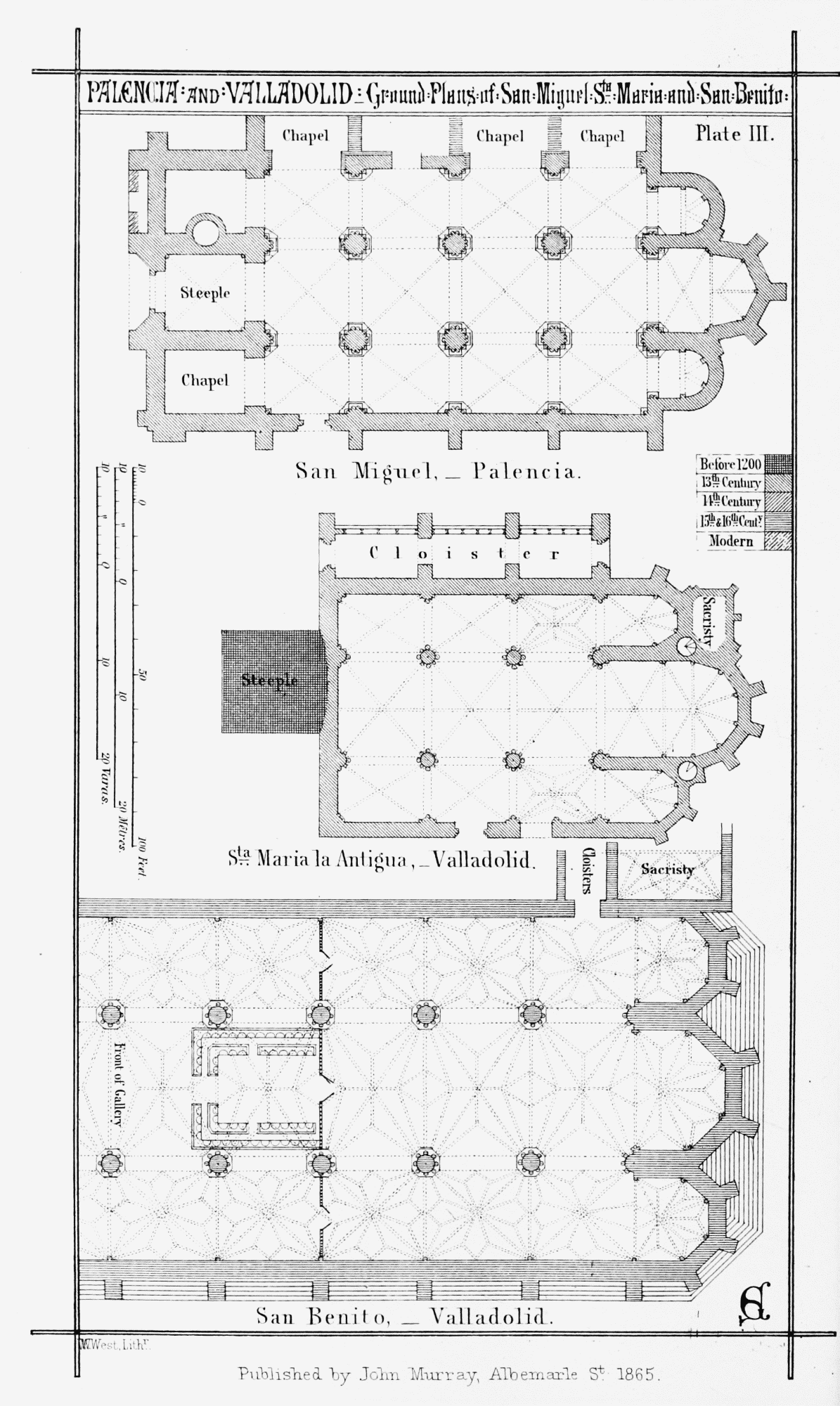 What I have here written will no doubt be supplemented and corrected by others hereafter; and much additional light will, I hope, be thrown upon the history of Spanish buildings and their architects. It will be found that I have referred to many Spanish authorities for the historical facts on which the dates of the buildings I have visited can alone be decided. Of these authorities none is more useful to the architect, none is more creditable to its authors, than the ‘Notices of the Architects and Architecture of Spain, by D. Eugenio Llaguno y Amirola, edited with additions by D. Juan Agustin Cean-Bermudez,’ in four volumes, compiled about the beginning of this century, but not published until A.D. 1829.[1]