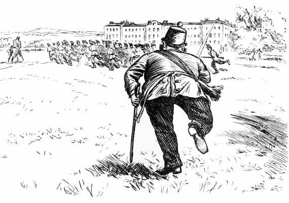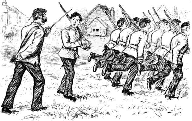 Auxiliary Recruit (to himself). "Murder! Murder! What'll I do now? 'Drill-Sarjint tould me always to Salute me Officer wid the far-off Hand, and here's Two iv em! Faix, I'll make it Straight for meself anyhow!"