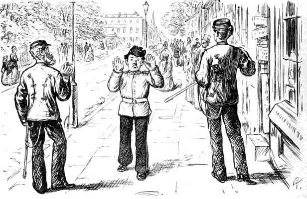 Constables (in chorus). "Hoy! Hullo! Stop! Turn back there! Can't come through the Park!"