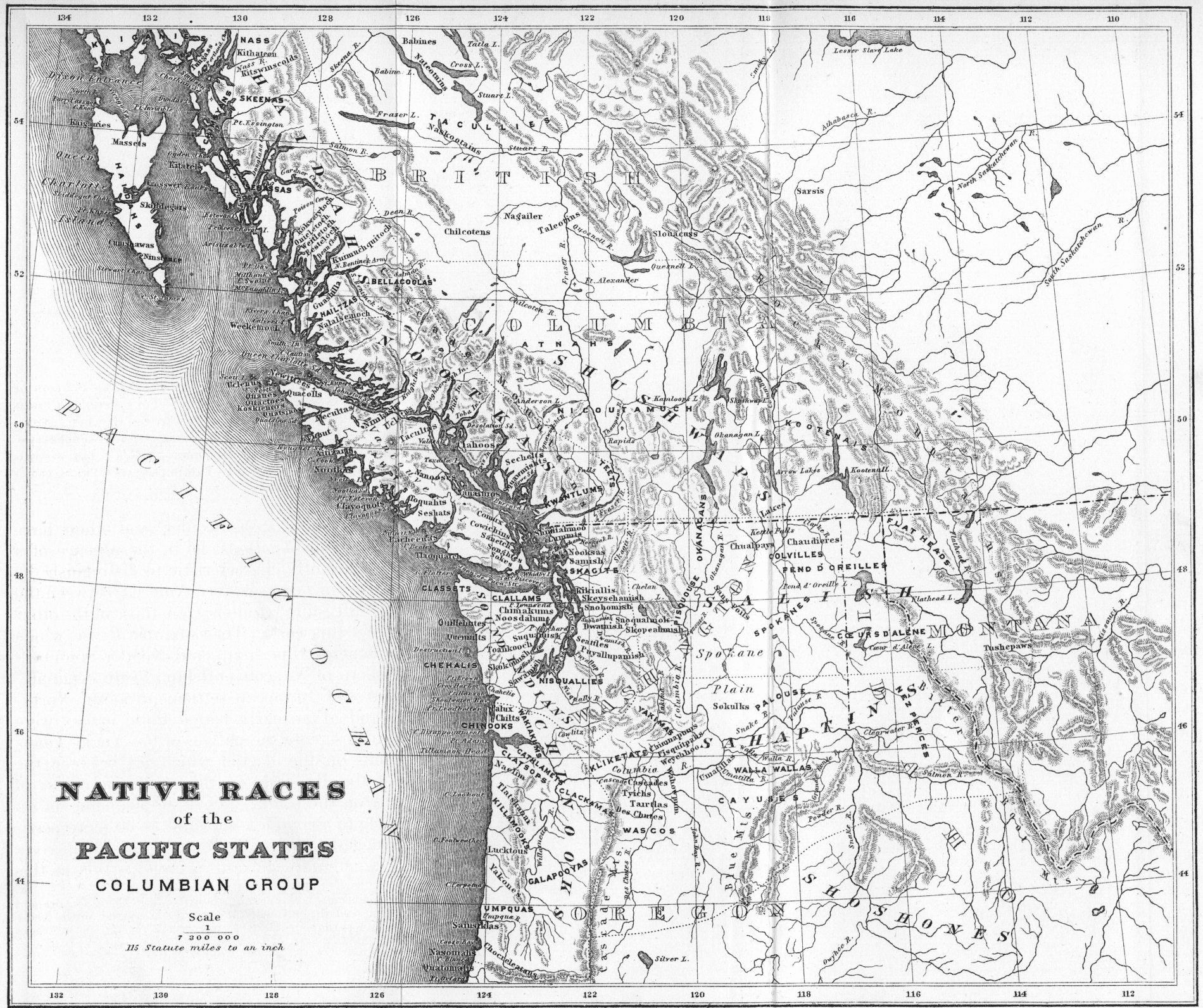 Habitat of the Columbian Group—Physical Geography—Sources of Food Supply—Influence of Food and Climate—Four extreme Classes—Haidahs—Their Home—Physical Peculiarities—Clothing—Shelter—Sustenance—Implements—Manufactures—Arts—Property—Laws—Slavery—Women—Customs—Medicine—Death—The Nootkas—The Sound Nations—The Chinooks—The Shushwaps—The Salish—The Sahaptins150