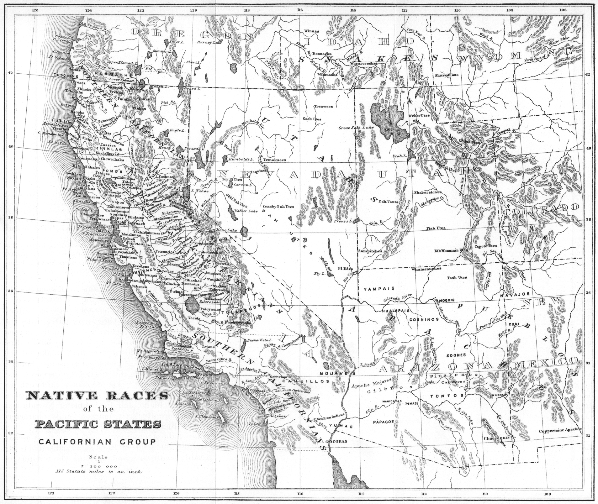 Groupal Divisions; Northern, Central, and Southern Californians, and Shoshones—Country of the Californians—The Klamaths, Modocs, Shastas, Pitt River Indians, Eurocs, Cahrocs, Hoopahs, Weeyots, xvi Tolewahs, and Rogue River Indians and their Customs—The Tehamas, Pomos, Ukiahs, Gualalas, Sonomas, Petalumas, Napas, Suscols, Suisunes, Tamales, Karquines, Tulomos, Thamiens, Olchones, Runsiens, Escelens, and others of Central California—The Cahuillos, Diegueños, Islanders, and Mission Rancherías of Southern California—The Snakes or Shoshones proper, Utahs, Bannocks, Washoes and other Shoshone Nations322