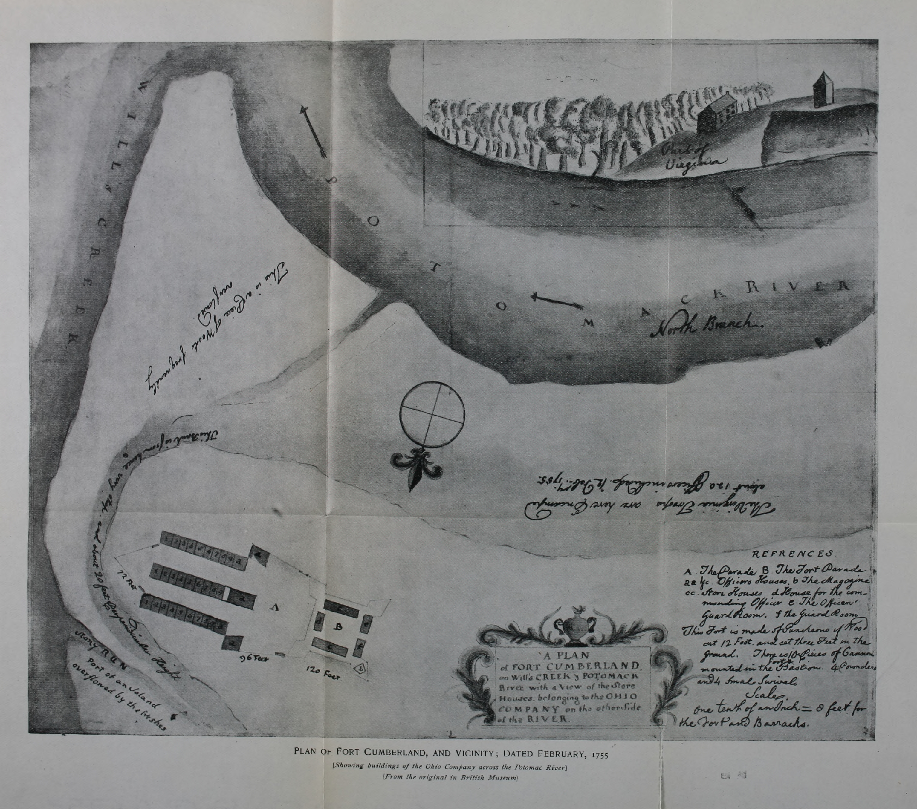 Plan of Fort Cumberland, and Vicinity; Dated February, 1755[Showing buildings of the Ohio Company across the Potomac River]