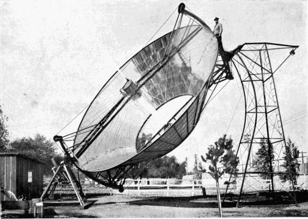 The Sun-Motor used on the Pasadena Ostrich-farm, California. It works a pump capable of delivering 1,400 gallons per minute.