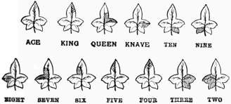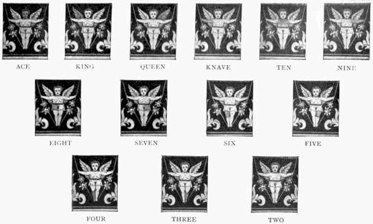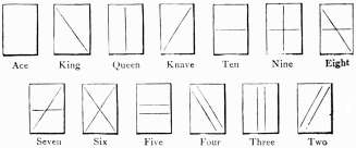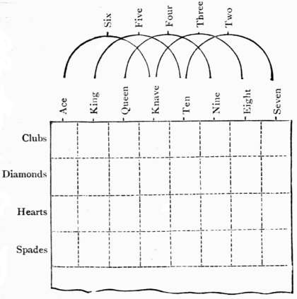 The chief desideratum in marking, of course, is to produce work which is easily decipherable to the trained eye of the expert, but which nevertheless is invisible to others. How well this has been accomplished will be seen from the examples which follow. Many of the specimens given herein have been submitted to experts who have been allowed to retain them as long as they pleased, and have been returned with the statement that to all appearance the cards have not been tampered with, no mark being discoverable. This being the case, what chance has a player of detecting the falsification, in the very cursory examination which is possible during play? As the reader will perceive, there is no difficulty in marking cards in such a manner as will arouse no suspicion. Anyone could invent a system which no one but himself could decipher, and which would defy detection. The only difficulty is to read the marks with speed and accuracy. In many games it is only necessary to know which are high cards[29] and which are low; then the matter is considerably simplified. In some games it is not even necessary to know the suit of the cards, and thus the case is simplified still further. It is rarely, indeed, that the sharp requires to know all the cards. Generally speaking, if all the picture-cards and the aces are marked, that will give him all the advantage he needs. The rest may be left to chance and good play. In fact, the sharp uses trickery as little as possible; he never overdoes the thing. Whilst he is winning, he is, as a rule, content to win fairly, for the most part. His subtle methods are reserved—or should be, if he knows his business—for occasions when chance is against him. The fewer are the cards which are marked, the less the chance of detection, and the less the marks are resorted to the better. Obviously, the man who has it in his power to stock his hand with high cards at will, need never be in a hurry to win. The game is in his hands. The sharp who uses marked cards will always contrive to 'work in' those he has prepared when possible, but failing this, he is generally in a position to mark all the cards he wishes to know during the course of the game, as we shall see further on.