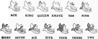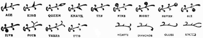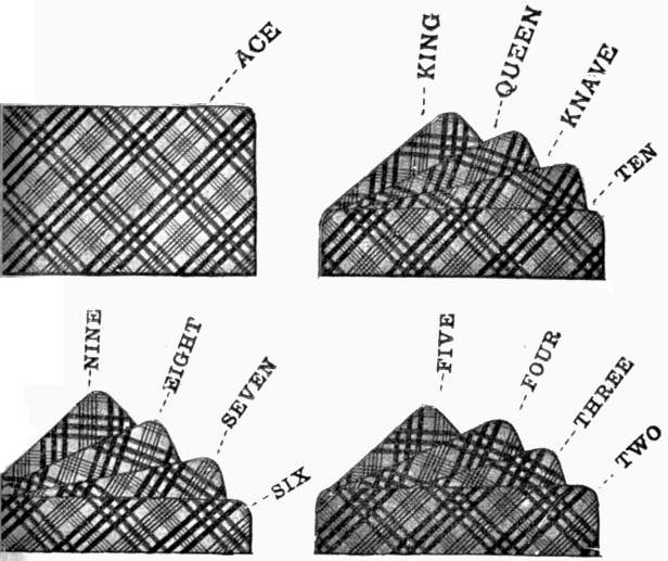 So numerous, indeed, are the systems of marking—almost every card-sharper, worthy of the name, having a system peculiar to himself—that it is impossible to give a tenth part of them. To attempt to do so would be to weary the reader, and, further, it is unnecessary. All these various systems are capable of general classification, and a few leading instances will suffice to give the key to the whole. For brevity and convenience, then, we will consider the subject under the following heads:—