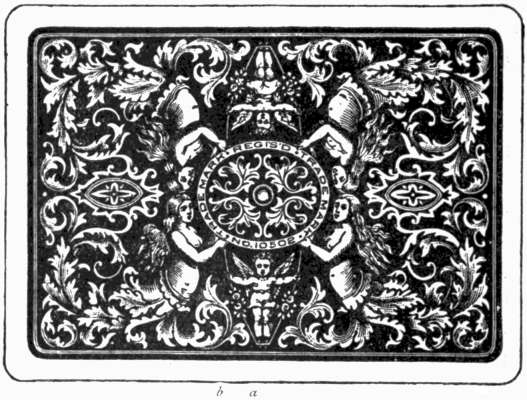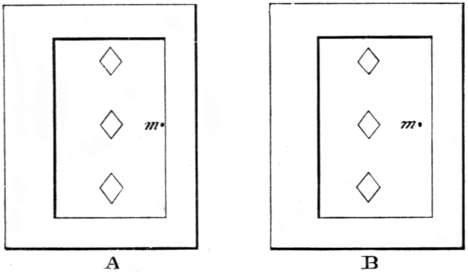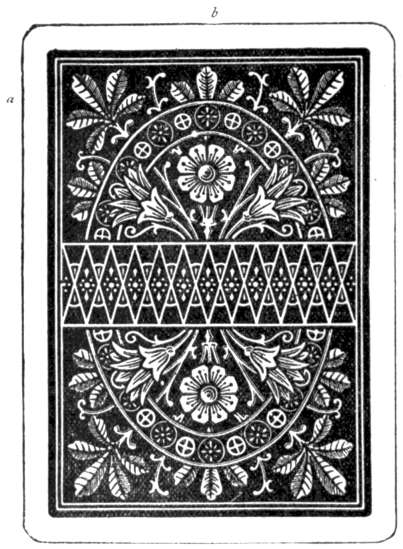 § B—The marking of unprinted backs.—It might very naturally be supposed, that the application of any system of marking to the backs of those cards which are of an even tint, without pattern, would be a very difficult[30] operation. Such, however, is by no means the case. One might think that any mark, however slight, placed upon the plain white back of a 'club-card,' must inevitably be discovered sooner or later. Such an idea, nevertheless, would indicate a very scant acquaintance with the resources which are available to the card-sharper.