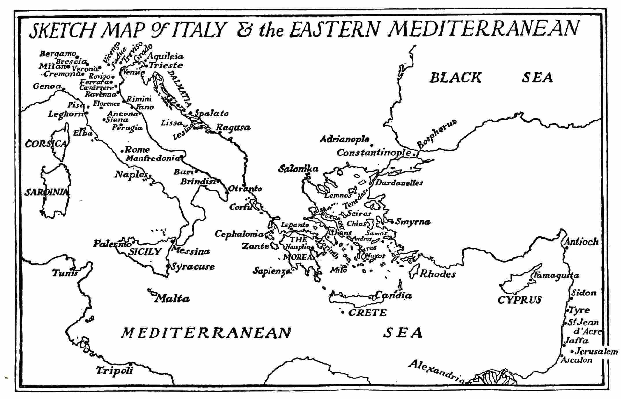 In the course of our story we have freely drawn from the old chronicles, while not neglecting modern historians, chiefest of whom is the Triestine Hebrew scholar, Samuele Romanin. Indeed, all that has been written on Venetian history during the past forty years does but increase our admiration for the imperturbable industry and sagacious judgment of the author of the Storia Documentata di Venezia, to whom our heaviest debt is due.