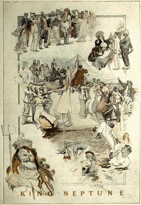 All the crew attended the show. Delegations of twenty-[306]five men from each of the battleships in the fleet came. They were met at the port gangway by ushers who had reserved seats for them. Programmes, the woodcuts for which were made on board—and the entire printing was done there as well—were handed out to each person as he took his place. The officers were given programmes at the starboard gangway by pages in bolero and plush breeches and silk stockings. An old naval custom was revived by having side boys with lanterns.