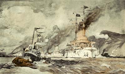 A stiff northwest wind seized hold of the great streamers of smoke that poured over the tops of smoke-pipes, and as these streamers frayed themselves out against the blue sky and the bright sun the breeze seemed to lift them toward the southeastern heavens, where some power wove them together to pull the ships along and give them a fine sendoff. All of Monday and Tuesday whoever it was in the kingdom of Old Boreas that was doing the tugging on the ships made a good job of it, for practically every vessel in the fleet had to check speed constantly.