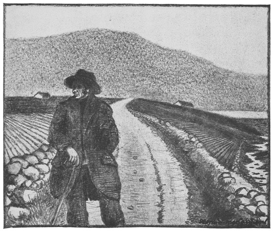 Through blown rain and darkness I see the Atlantic tumble in white, ghost-like masses on the strand. Beevna is a shadow, the crosses shadows. Only one friendly light burns in the valley. The patter of rain and the dull boom of the surf ring ceaselessly in my ears. The hills brood: my thoughts brood with them. I stare into the sunset—a far-drawn, scarlet trail—with mute, wondering eyes. Remoteness grips me, and is become a reality in this ultimate mearing of a grey, ultimate land.