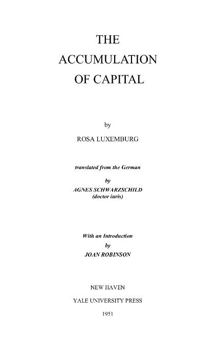 Academic economists have recently returned from the elaboration of static equilibrium to the classical search for a dynamic model of a developing economy. Rosa Luxemburg, neglected by Marxist and academic economists alike, offers a theory of the dynamic development of capitalism which is of the greatest interest. The book is one of considerable difficulty (apart from the vivid historical chapters), and to those accustomed only to academic analysis the difficulty is rendered well-nigh insurmountable by the Marxist terminology in which it is expressed. The purpose of this preface is to provide a glossary of terms, and to search for the main thread of the argument (leaving the historical illustrations to speak for themselves) and set it out in simpler language.