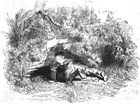 Gemakkelijk begrijpt men, dat wij op het hooren van Vrijdags schot, allen onze paarden aanzetten, en zoo hard als de weg, die zeer moeijelijk was, toeliet, opreden, om te zien wat er te doen was. Zoodra wij de boomen, die ons het uitzigt benamen, voorbij waren, zagen wij wat het geval was, en hoe Vrijdag den armen gids ontzet had, schoon wij nog niet zien konden, welk beest hij gedood had.