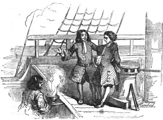 Tegen drie uren des middags was hij bij ons; maar daar hij door een misslag ons op zijde kwam, in plaats van achter onzen spiegel, bragten wij acht stukken aan die zijde en gaven hem daarmede de volle laag, die hem deed afhouden, na ons de laag en het klein geweervuur van tweehonderd man gegeven te hebben. Niemand was echter bij ons getroffen, daar al ons volk zich omlaag hield. Hij maakte zich tot een nieuwen aanval, en wij tot verdediging gereed; doch toen hij ons op de andere zijde aan boord kwam, enterde hij met negentig man, die dadelijk het tuig kapten en het dek. Twee maal dreven wij hen met klein geweervuur, halve pieken, handgranaten, enz., van ons dek af. Eindelijk echter, om deze treurige geschiedenis te bekorten, was ons schip reddeloos, twee of drie van ons volk gedood en acht gewond; en wij, genoodzaakt ons over te geven, werden allen als gevangenen in Salé, eene Moorsche haven op de Barbarijsche kust, binnengebragt.