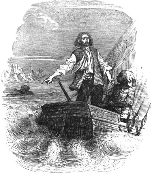 Na eenigen tijd gevischt en niets gevangen te hebben, want als ik beet had, haalde ik niet op, zeide ik tot den Moor: "zoo gaat het niet; dit zal onzen meester weinig baten, wij moeten dieper in zee gaan." Hij vermoedde niets kwaads, maar stemde er in toe, en daar hij voor in de boot was, stelde hij de zeilen. Daar ik aan het roer zat, liet ik het eene mijl in zee loopen, en draaide toen bij als om te visschen. Ik gaf daarop den jongen het roer, liep naar voren, bukte als om iets op te rapen, greep den Moor onverhoeds bij den gordel, en wierp hem over boord. Hij kwam bijkans op hetzelfde oogenblik boven, want hij zwom als een visch, en smeekte mij hem op te nemen, terwijl hij zwoer mij overal ter wereld te willen volgen. Hij zwom zoo vlug, dat hij, daar er weinig wind was, de boot spoedig ingehaald zou hebben. Ik ging dus naar de kajuit, haalde er een geweer uit en legde op hem aan. "Zoo gij mij ongemoeid laat, zal ik u geen kwaad doen," zeide ik, "maar zoo gij de boot nadert, zal ik u een kogel door het hoofd jagen. De zee is stil, en gij kunt gemakkelijk naar den wal zwemmen. Ik wil mijne vrijheid weder hebben." Hij keerde zich om en zwom naar het strand, dat hij zeker zal bereikt hebben, want hij zwom uitmuntend.
