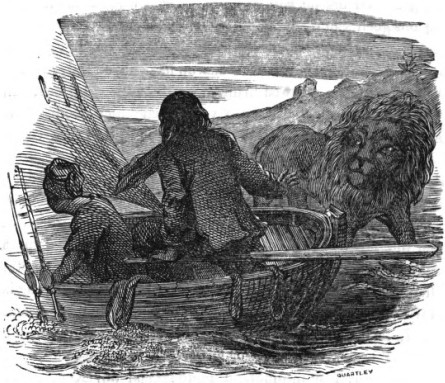 Xury was half dood van angst en ik ook; maar het werd nog erger, toen wij een dier geweldige beesten naar onze boot hoorden toezwemmen; wij konden hem niet zien, maar hoorden zijn verschrikkelijk gesnuif. Xury zeide, dat het een leeuw was, hetgeen wel waar zijn kon, en riep, dat wij het anker ligten en wegroeijen moesten. "Neen Xury," zeide ik, "wij kunnen ons touw laten glippen met een boei er op; hij kan ons niet vervolgen." Naauwelijks had ik dit gezegd, of ik zag geen twee riemslengten van mij af het beest, hetgeen mij een weinig van mijn stuk bragt. Ik ging echter dadelijk in de tent, nam een geweer en schoot op het dier, dat dadelijk omkeerde en naar het strand zwom.