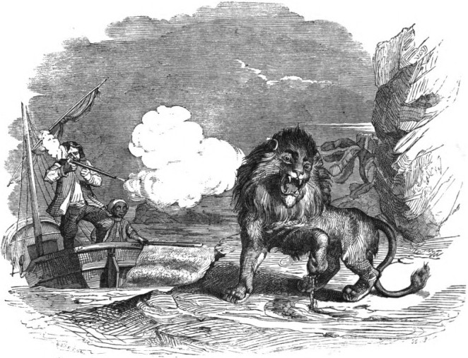 Verscheidene malen moest ik aan land gaan, om zoet water in te nemen. Eens lieten wij daarom het anker vallen bij eene hooge landtong. Het was vroeg in den ochtend, en daar de vloed doorkwam, wilden wij wachten om dieper landwaarts in te kunnen gaan. Xury, wiens gezigt scherper was dan het mijne, riep mij zacht en zeide, dat het best ware zoo wij verder van het strand gingen, terwijl hij mij een verschrikkelijk grooten leeuw wees, die tegen de zijde van den heuvel lag te slapen. "Ga naar den wal, Xury," zeide ik, "en schiet dien leeuw dood." Hij beefde echter van schrik, en zeide: "Hij mij dooden! Ik een mond voor hem." Hij meende een mond vol. Zonder hem meer te zeggen wenkte ik hem, dat hij stil zou zijn, en nam mijn grootste geweer, en laadde het met twee kogels en eene goede lading kruid; even zoo het tweede, en op het derde geweer deed ik vijf kleinere kogels. Ik mikte zoo goed ik kon met het eerste, om hem in den kop te treffen; maar daar hij op zijn buik lag, met zijne voorpooten voor zijn muil, trof ik een van deze op de hoogte van de knie. Brullende sprong hij op, doch viel dadelijk weder neder; spoedig echter stond hij weder op drie pooten en liet een allerafgrijsselijkst gebrul hooren. Ik nam dadelijk het tweede geweer en juist toen hij heen wilde gaan, trof ik hem in den kop, en had het genoegen hem in stuiptrekkingen te zien neerzijgen, terwijl hij weinig geluid meer gaf. Toen kreeg Xury weder moed en wilde, dat ik hem aan wal liet gaan. "Welnu ga," zeide ik. Hij nam in de eene hand een geweer, zwom met de andere naar het strand, en bij het dier gekomen, hield hij den tromp van het geweer in zijn oor, en schoot hem nogmaals door het hoofd, waarop hij dadelijk stierf.