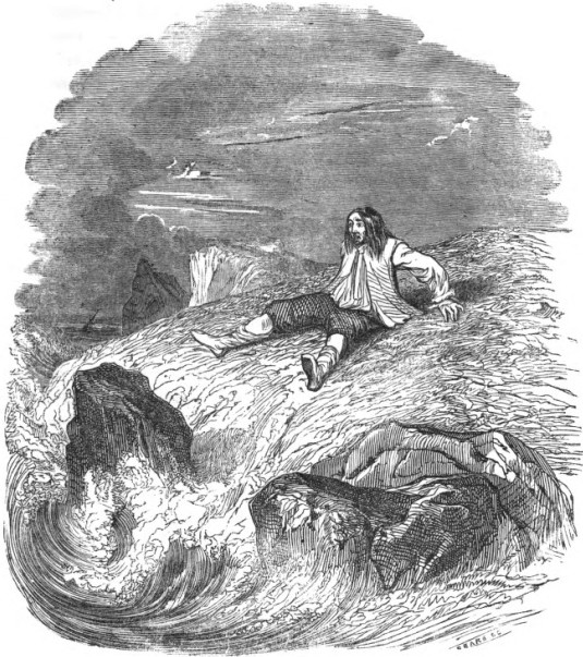 Iemand, die zoo iets nimmer bijgewoond heeft, kan moeijelijk de heerschende ontsteltenis begrijpen. Wij wisten niet waar wij waren, noch op welk land wij geworpen waren; of het een eiland of vast land, bewoond of onbewoond was. Daar de wind nog hevig was, schoon het niet meer zoo geweldig stormde, konden wij niet hopen, dat het schip het langer dan eenige minuten kon houden, zonder verbrijzeld te worden, ten ware de wind, door een wonder, onmiddellijk omliep. Kortom, wij zagen elkander aan, en verwachtten elk oogenblik den dood; ons voorbereidende op den overgang in eene andere wereld, want in deze hadden wij weinig meer te verrigten. Onze eenigste hoop was, dat het schip nog heel bleef, en de kapitein opmerkte, dat de wind begon te gaan liggen.