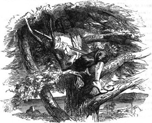 Spoedig was de beer bij den boom gekomen, en wij volgden op een afstand. Eerst bleef hij bij het geweer staan, berook het, maar liet het liggen, en klom toen als eene kat in den boom, schoon hij zulk een plomp dier was. Ik stond versteld van de dolheid van mijn knecht, en kon nog maar niets zien om te lagchen, doch toen wij den beer op den boom zagen, reden wij allen er digter naar toe. Toen wij er bij kwamen, was Vrijdag aan het dunne eind van een zwaren arm van den boom gekomen, en de beer was er halverwege op. Zoodra Vrijdag zag, dat hij het einde van den tak naderde, riep hij ons toe: "Nu zult gij een beer zien leeren dansen." Hij begon dus den tak te schudden en er op te dansen, zoodat de beer begon te waggelen en achterom keek, alsof hij den aftogt wilde slaan, en wij ons van lagchen niet konden bedwingen. Maar Vrijdag had nog niet met hem gedaan; toen hij zag, dat hij stil stond, riep hij hem weder toe, alsof het beest hem verstaan kon: "Kom wat nader, vriend; kom wat nader als het u belieft!" Daarop bleef hij stil zitten, waarop de beer wat verder vooruit kwam, toen begon hij weder te springen, en de beer bleef stokstijf staan.