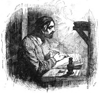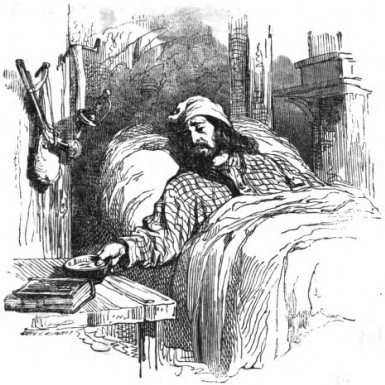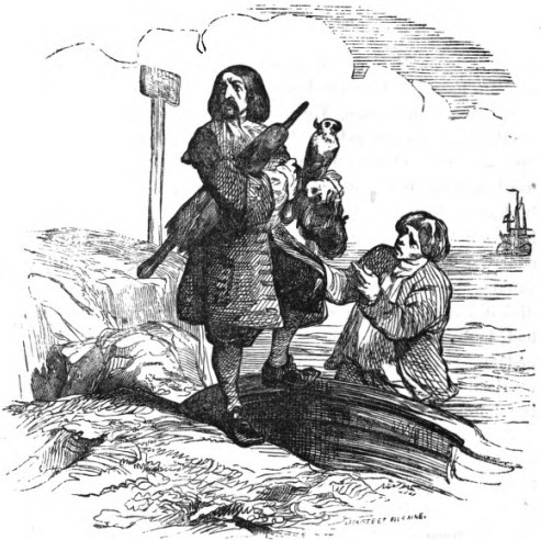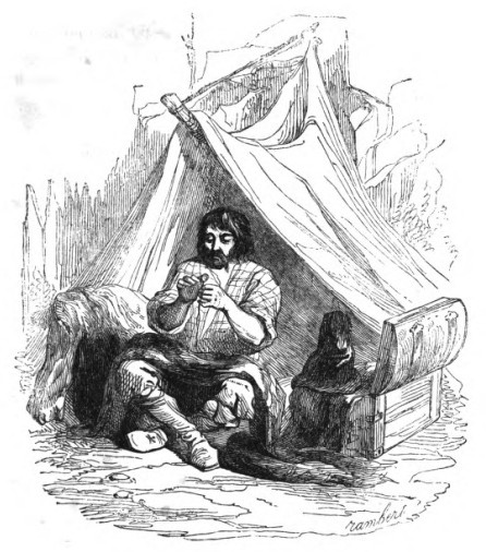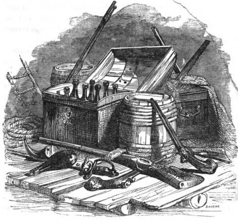 Eerst zocht ik een voorwendsel, om den Moor over te halen, dat hij wat eten aan boord bragt; ik zeide hem, dat het ons niet paste het eten van onzen meester aan te spreken. Dat is waar, zeide hij, en bragt een grooten zak roesk, of Moorsche beschuit, en drie groote kruiken met water in de boot. Ik wist waar mijn meesters likeurkist stond, die, naar het maaksel te zien, uit een Engelschen prijs afkomstig was, en bragt die aan boord terwijl de Moor aan den wal was. Ook nam ik nog een klomp was van wel vijftig pond aan boord, om kaarsen van te maken, met een pak garen, eene bijl, een zaag, en een hamer, 't geen ons alles naderhand voortreffelijk te pas kwam, vooral het was. Ik spande mijn makker nog een strik, naar hij argeloos in liep. "Muley," zeide ik, "de geweren van onzen meester zijn aan boord; zoo gij wat kruid en lood verschaffen kondt, zouden wij misschien voor ons eenige alkamis (eene soort van wulpen) kunnen schieten, want ik weet dat er kruid en lood aan boord van het schip is."—"Ja," zeide hij, "ik zal het gaan halen." Hij bragt ook een lederen zak, die ongeveer anderhalf pond kruid bevatte, en een anderen met hagel en eenige kogels. Middelerwijl had ik ook nog eenig kruid in de tent gevonden en daarmede eene flesch gevuld, na hetgeen er in was, in eene andere overgegoten te hebben.
