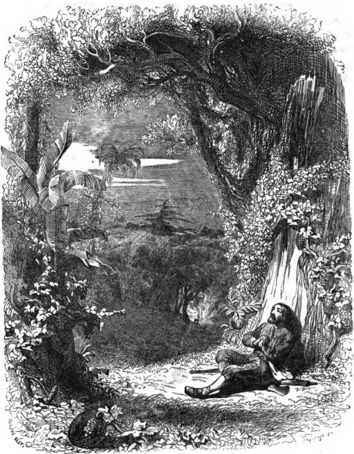 Gemakkelijk begrijpt men, dat wij op het hooren van Vrijdags schot, allen onze paarden aanzetten, en zoo hard als de weg, die zeer moeijelijk was, toeliet, opreden, om te zien wat er te doen was. Zoodra wij de boomen, die ons het uitzigt benamen, voorbij waren, zagen wij wat het geval was, en hoe Vrijdag den armen gids ontzet had, schoon wij nog niet zien konden, welk beest hij gedood had.