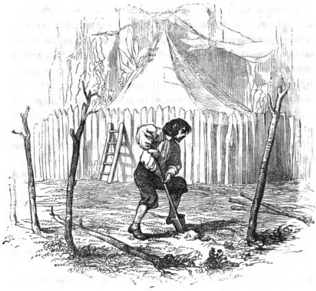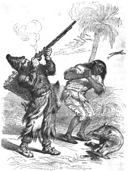 Wij dachten, dat het nu een geschikt tijdstip was, om hem voor den kop te schieten, en dus riep ik Vrijdag toe, stil te zitten, dat wij den beer zouden schieten, maar hij riep: "Niet schieten! niet schieten! Ik zal hem straks wel schieten." Om kort te gaan Vrijdag danste zoo lustig en de beer stond zoo uit het veld geslagen, dat wij ons lagchen niet konden bedwingen, schoon ik nog niet begrijpen kon, wat hij doen wilde. Eerst dachten wij, dat hij den beer uit den boom zou laten tuimelen, maar daar was de beer te slim toe, want hij kwam niet ver genoeg, en hield zich met zijne breede klaauwen zoo stevig vast, dat wij niet begrepen, hoe het af zou loopen.