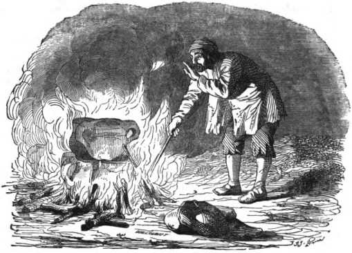Het andere beest, door den slag en het vuur van mijn geweer verschrikt, zwom naar den wal en vloog naar het gebergte, vanwaar het gekomen was. De verte belette mij te zien welk dier het was. Ik bemerkte spoedig dat de Negers het luipaardenvleesch eten, en wilde het dus als eene gunst van mij geven. Toen ik hun door teekens te kennen gaf, dat zij hem nemen zouden, waren zij er zeer dankbaar voor. Ofschoon zij geen messen hadden, vilden zij hem met een scherp hout zoo vlug, ja veel vlugger dan wij het met messen hadden kunnen doen. Zij boden mij een deel van het vleesch aan, dat ik weigerde en hun door teekens te kennen gaf, dat ik hun alles schonk, doch ik wees hun dat ik de huid hebben wilde, die zij mij dadelijk gaven, met eene menigte van hunnen voorraad, dien ik aannam, zonder te weten wat ik er mede doen zou. Vervolgens gaf ik door teekens mijn verlangen naar water te kennen, en hield hun ten dien einde eene onzer ledige kruiken omgekeerd voor, om hun te doen zien, dat die ledig was, en gevuld moest worden. Zij riepen dadelijk eenigen hunner, en twee vrouwen kwamen met eene groote pot, van klei gemaakt en in de zon gedroogd, naar ik denk; deze plaatsten zij voor mij, en ik zond Xury met mijne kruiken aan het strand, die ze daaruit vulde. De vrouwen waren zoo wel naakt als de mannen.