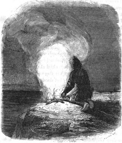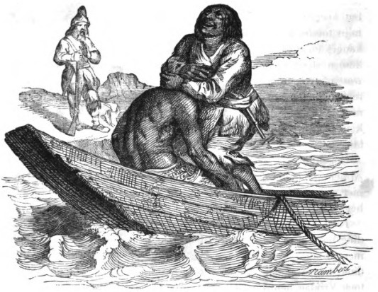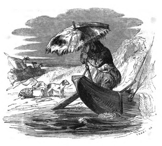 Op een morgen waren wij bij stil weder met hem uit visschen, toen er plotseling zulk een dikke mist opkwam, dat wij de kust uit het oog verloren, schoon wij er geene halve mijl van af waren. Wij roeiden dus den geheelen dag en nacht, zonder te weten waarheen, en toen de zon opkwam zagen wij, dat wij zeewaarts, in plaats van naar den wal, geroeid hadden, en er wel twee mijlen van af waren. Wij kwamen behouden weder binnen, schoon niet zonder gevaar en met zwaar werken; en bovenal duchtig uitgehongerd.