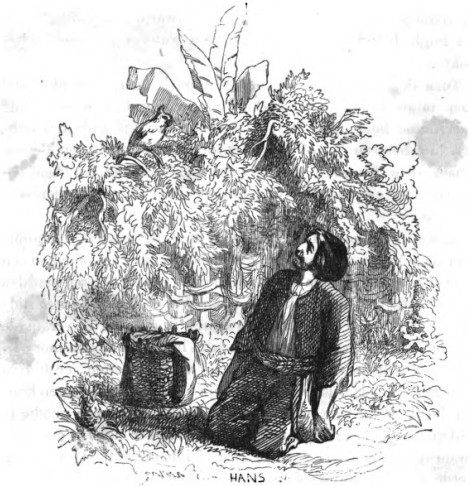 Eindelijk maakte Vrijdag er een einde aan, en riep den beer toe: "Komt gij niet bij mij, dan zal ik bij u komen." Daarop schoof hij achteruit tot aan het uiterste einde van den tak, die door zijne zwaarte nederboog, zoodat hij gemakkelijk op den grond kon springen, gelijk hij deed, en toen zijn geweer halen ging. "Wel Vrijdag, waarom schiet gij hem nu niet?" vroeg ik. "Nog niet schieten," zeide Vrijdag, "eerst nog wat lagchen, dan zal ik hem schieten." Toen de beer zijn vijand vertrekken zag, klom hij van den zijtak af, maar uiterst benaauwd en bij iederen stap achterom ziende, tot dat hij den stam bereikt had. Toen klom hij verder zeer langzaam en zeer schroomvallig, voetje voor voetje achteruit, en even voor hij zijn achterpoot op den grond zette, liep Vrijdag naar hem toe, stak den tromp van zijn snaphaan in zijn oor en schoot hem zoo dood als een steen.