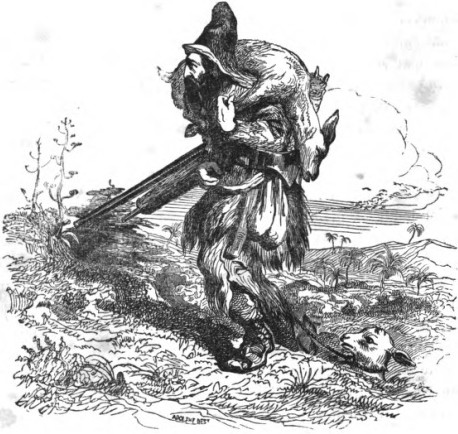 Ik wilde de boot niet uit het oog verliezen, uit vrees, dat de wilden met kanoes de rivier af mogten komen, maar de knaap zag een kwartier uurs verder eene laagte, en liep daarheen; na korten tijd zag ik hem terug komen. Denkende, dat hij door een verscheurend dier of wilden vervolgd werd, liep ik naar hem toe, om hem bij te staan. Toen ik echter digt bij hem kwam, zag ik, dat hij over zijn schouder een dier had hangen, dat hij geschoten had, naar een haas gelijkende, maar langer van beenen en anders van haar. Wij waren er zeer mede in onzen schik, want het leverde ons een uitmuntend middagmaal op. Xury had er vooral zijne vreugde in, dat hij goed water en geene wilden aangetroffen had.