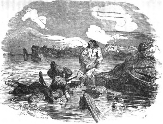Zij gingen juist in de boot toen Vrijdag en de stuurman begonnen te roepen. Zij hoorden en antwoordden hen en liepen westwaarts het strand langs, op de stemmen af, die zij gehoord hadden. Hier stuitten zij op de kreek, waar zij, daar het hoog water was, niet over konden, en de matrozen in de boot riepen om bij hen te komen en hen over te zetten, gelijk ik vermoed had.
