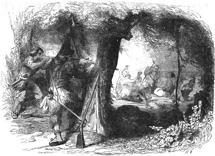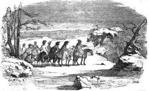 Toen wij daarop den ingang, waar het paard uitgekomen was, binnengereden waren, zagen wij een verschrikkelijk tooneel. Wij vonden nog een paard en twee menschen, die de wolven verscheurden. Ongetwijfeld had een der mannen het geweer afgeschoten, want dit lag naast hem, doch de wolven hadden hem reeds half verslonden. Vol afgrijzen wisten wij eerst niet wat te doen, doch de wolven lieten ons weinig tijd van beraad, want zij verzamelden zich om ons heen, en schenen ons tot hunne prooi uitgekozen te hebben. Ik geloof, dat er wel driehonderd waren. Tot ons geluk lagen digt bij den ingang van het bosch eenige zware boomstammen, die den vorigen zomer zeker geveld en nog niet weggehaald waren. Ik plaatste mijne kleine troep achter deze, en vormde zoo een driehoekig front met de paarden in het midden. Het was tijd, want weldra kwamen zij met een dof gegrom aanzetten en beklommen onze borstwering, als waren zij zeker van hunnen buit. Het schijnt, dat zij vooral woedend werden door onze paarden achter ons te zien. Ik gelastte, dat men om den anderen man weder zou vuren, en ieder mikte zoo goed, dat bij de eerste losbranding verscheidene wolven sneuvelden, maar wij moesten aanhoudend doorvuren, want de achtersten dreven de voorsten aanhoudend als ware duivels vooruit. Bij onze tweede losbranding schenen zij tot staan gebragt, maar het was slechts voor een oogenblik, want er kwamen weder anderen opzetten, dus deden wij twee losbrandingen met onze pistolen, en doodden geloof ik wel zeventien of achttien en kwetsten zeker eens zooveel, maar toch kwamen er meer opzetten.