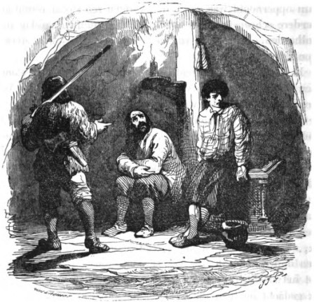 Thans begreep ik, dat het tijdstip onzer bevrijding naderde, en dat het gemakkelijk zou zijn, deze knapen tot een aanslag op het schip over te halen. Dus sloop ik in het duister vandaar weg, opdat zij niet zien zouden wat slag van een gouverneur zij hadden, en ontbood den kapitein tot mij. Toen ik op een afstand was, werd een der mannen bevolen als voren te spreken, en te zeggen: "kapitein, de kommandant laat u roepen!" De kapitein antwoordde: "zeg aan zijne excellentie, dat ik oogenblikkelijk kom." Dit bragt hen geheel in den waan, dat ik met mijne vijftig man vlak in de nabijheid stond. Toen de kapitein bij mij kwam, deelde ik hem mijn ontwerp om het schip te overmeesteren mede, waarmede hij van harten instemde, en wij besloten het den volgenden morgen ten uitvoer te brengen. Ten einde het echter te geruster en goed doordacht te verrigten, zeide ik hem, dat wij de gevangenen moesten verdeelen, en dat hij Atkins en nog twee van de ergsten gebonden naar de grot moest laten brengen. Dit werd aan Vrijdag en de twee mannen, die met den kapitein aan wal gekomen waren, toevertrouwd. Zij bragten hen naar de grot, alsof dit de gevangenis was, en werkelijk was het eene treurige plaats, vooral voor lieden in hunnen toestand.