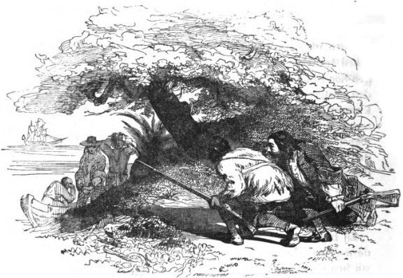 Mijn volk had gaarne verlof van mij willen hebben, om hen in het duister te overvallen; maar ik wilde er zooveel van sparen, en zoo weinig van doodschieten als mogelijk, en vooral wilde ik niet gaarne een van ons volk aan het gevaar blootstellen van een kogel van hen te ontvangen; daar ik wist, dat zij zeer goed gewapend waren. Ik besloot af te wachten of zij zich niet zouden verdeelen, en om derhalve te beter de overmagt op hen te hebben, liet ik mijne hinderlaag naderbij rukken, en gelastte Vrijdag en den kapitein op handen en voeten, en zoo digt langs den grond als zij konden, naar hen toe te kruipen en hen zoo digt mogelijk te naderen, alvorens zij vuur gaven. Niet lang waren zij in die houding gebleven of de bootsman, die de voornaamste belhamel van de muiterij was geweest, en die zich van allen het snoodst en laaghartigst gedragen had, kwam met nog twee van het volk naar hen toe. De kapitein werd woedend, toen hij den voornaamsten aanlegger zoo digt onder zijn bereik zag, dat hij zich naauwelijks tijd gunde om hem zoo digt te laten naderen, dat hij zeker van hem was, want hij had nog alleen zijne stem gehoord; maar toen zij naderkwamen sprongen de kapitein en Vrijdag op de been en gaven vuur op hen. De bootsman viel dood neder; de man, die bij hem was, had een kogel in het lijf gekregen en viel naast hem, schoon hij eerst een paar uur daarna stierf, en de derde liep weg.