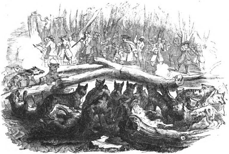 Dit gaf ons tijd onze wapenen weder te laden, gelijk wij zonder dralen deden; naauwelijks was dit echter geschied of wij hoorden aan onze linkerzijde, in hetzelfde bosch doch verder af, weder een verschrikkelijk geweld, van den kant dien wij moesten heentrekken. De nacht begon in te vallen, en de duisternis maakte onzen toestand nog hagchelijker; doch wij konden, toen het rumoer heviger werd, duidelijk het gehuil dier helsche beesten onderkennen, en plotseling zagen wij twee of drie troepen wolven, een op zijde, een van achteren en een voor ons uit, zoodat wij geheel omringd schenen. Daar zij ons echter niet aanvielen, zetten wij onzen weg voort, zoo snel onze paarden voort komen konden, hetgeen slechts op een middelmatigen draf was, daar de weg slecht was. Op deze wijze kwamen wij aan den ingang van het bosch, dat wij na de vlakte, door moesten trekken, maar wij zagen met leede oogen, toen wij bij den engen weg of laan, die er door liep, kwamen, dat vlak aan den ingang eene groote troep wolven stond. Plotseling hoorden wij van eene andere opening in het bosch een geweerschot, en een paard met zadel en toom kwam er uitvliegen als de wind met zestien of zeventien wolven achter zich. Het paard liep sneller, maar kon het niet lang zoo uithouden, en zij moesten het weldra inhalen.