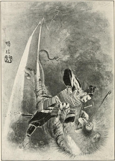 When he reached the island of Kiushiu he made his way to the province of Higo, and finally settled down in the plain of Kumamoto. Now that Tametomo found himself free to do just as he liked, his thirst for conflict became so great that he could not restrain himself. He gathered round him a band of fighters as wild as himself and challenged the men in all the neighbouring provinces to come out and match their strength against his. In twenty battles which followed this challenge Tametomo was never once defeated, so great was his strength, and his cleverness in directing his soldiers. He was like a silkworm eating up the mulberry tree. Just as the silkworm devours one leaf after another, with slow but sure relentlessness, so Tametomo fought and fought the inhabitants of the provinces round about till he had brought them all into subjection under him. By the time he was eighteen years old he had made himself chief of a large band of outlaws, distinguished for their reckless bravery, and with them he had mastered the whole of Kiushiu, the western part of Japan. It was now that the name of Chinsei was given him on account of his having conquered the West. Chin means "to put down," and sei means the "West."