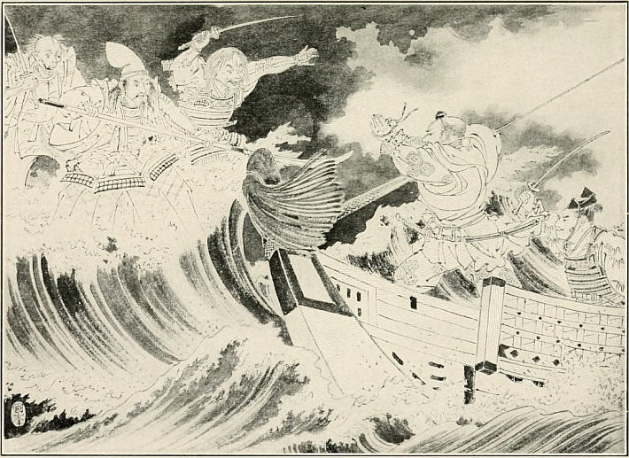 As he expected, he came to an island, after sailing from sunrise to sundown. To his amazement he found the place inhabited by creatures very different from human beings. They had dark red faces, with shocks of bright red hair, the locks of which hung over their foreheads and eyes. They looked just like demons. A whole crowd of these alarming-looking creatures were standing on the beach when Tametomo landed. When they caught sight of him they talked and gesticulated wildly amongst themselves and with fierce looks they rushed towards him.