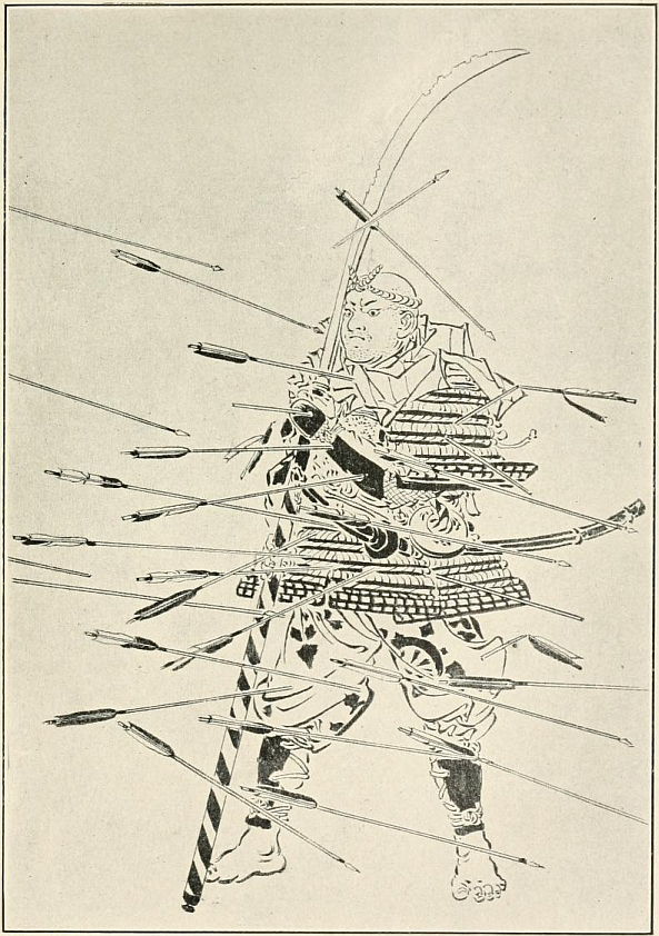 Yoshitomo had no words wherewith to answer his brother and was silent. Tametomo, with his archer's eye, saw what a good mark his brother made just outside the gate, and he was greatly tempted to shoot at him even for sport. But he said that though war found them fighting on opposite sides, yet they were brothers, born of the same mother, and that it would be acting against his conscience to kill or hurt his own brother, for surely he would do so if he took aim seriously! He would however for the sake and love of sport continue to show Yoshitomo what a clever marksman he was. Taking good aim at Yoshitomo's helmet, Tametomo raised his bow and shot an arrow right into the middle of the star that topped it. The arrow pierced the star, came out the other side, and then cut through a wooden gate five or six inches in thickness.