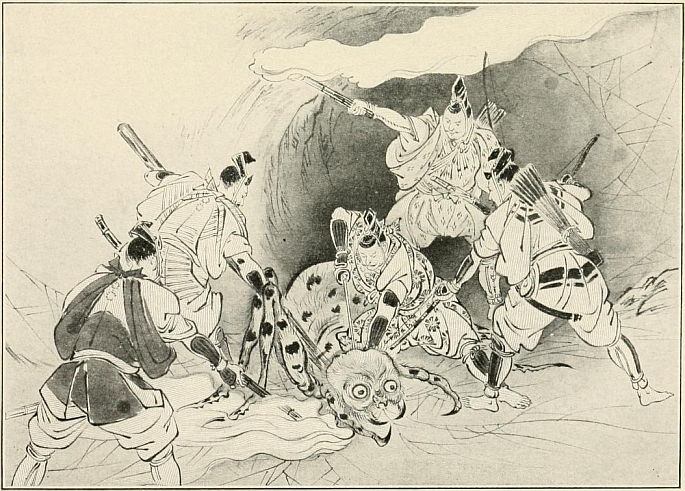 Tidings travelled slowly in those days, for there were no railways or telegraph wires forming a network of lightning speed communication across the land, and all carrying of news was done on foot by messengers; so it was a long time before the Government at the capital heard of the wild and lawless doings of Chinsei Hachiro Tametomo, but at last his daring exploits became known, and the Government decided to interfere and to put a stop to his outlawry. They sent a regiment of soldiers to hunt him down and take him prisoner, but Tametomo and his band were not only strong and fearless, but sharp of wit, and in the frequent skirmishes that took place they always came out victorious. At last the soldiers gave up their task of capturing him, for they found it impossible to overcome him and nothing would make Tametomo surrender. So the general returned to the capital and confessed that his expedition had failed. The Government now decided to arrest the outlaw's father, Tameyoshi, and so try to bring the rebel to bay. Tameyoshi was therefore seized and punished for being the parent of such an incorrigible rebel.