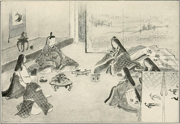 The Emperor was pleasingly impressed with Taro's talent and facility in expressing his graceful thoughts, and addressed him again, saying: "I hear you came from Shinano? How do you call plum-blossoms [ume-no-hana] there?"