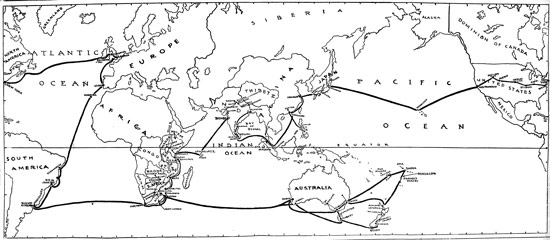 As the major portion of my travel was by water, the nautical word Leg has been chosen as a designating term for the different sections of the world visited, embracing South American cities, South Africa, Zululand, and Victoria Falls, in Rhodesia; Australia, New Zealand and principal South Sea Island groups; then back to Africa and up the East Coast to Zanzibar and Mombasa; next through British East Africa to and across v Victoria Nyanza into Uganda. Leaving Africa, we sailed over the Indian Ocean to India, visiting, among other features in that country, the Himalaya Mountains, and afterwards Ceylon. From Colombo we traveled eastward to the Straits Settlements, Philippines, China and Japan, concluding observations at the Hawaiian Islands. The journey was from New York to New York over the territory briefly outlined in the foregoing itinerary.