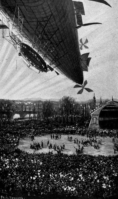 Die Taue, mit denen das Riesenluftschiff am Boden befestigt war, wurden vorsichtig gelöst. Langsam, in stolzer Sicherheit erhob sich der Weltensegler gen Himmel. Unterdessen hatte sich trotz der frühen Morgenstunde eine Menge von Neugierigen auf dem Wasen eingefunden, die mit Staunen und lauter Bewunderung den Bewegungen des Luftschiffes folgten. Hoch oben in der Luft, kaum noch erkennbar, bald rückwärts, bald vorwärts flog der Weltensegler, willig der Steuerung gehorchend wie das flinkste Schiff im Wasser. In raschem Fluge und weitem Bogen zog das Luftschiff über Stuttgart hin, kehrte wieder über den Ort des Aufstieges zurück und ließ sich langsam und majestätisch genau auf dem Punkt nieder, von dem es ausgegangen war.