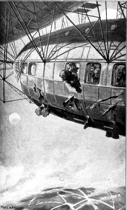 Das innere Gerippe des Ballons bestand aus einem Netzwerk von luftleer gemachten, sehr dünnen, aber außerordentlich starken Metallblechröhren. Darüber legte sich ein zweites, gleich konstruiertes Gerippe und über dieses ein drittes. Wohl waren die drei Lagen unter sich verbunden, aber doch so, daß auch jede einzelne für sich allein tätig sein und die Gondel tragen konnte. Es war sozusagen ein dreifach übereinander gestülpter Ballon.