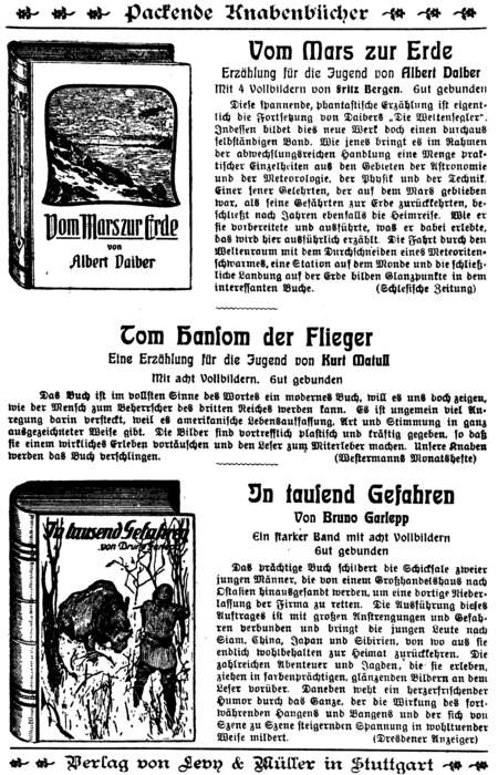 „Zuerst müssen wir nach dem Mars gekommen sein, bevor wir überhaupt an eine Rückkehr denken können,“ entgegnete Professor Stiller lächelnd. „Einige Jahre dürfte unsere Abwesenheit von hier schon dauern; denn eine solche ungeheure Reise erfordert begreiflicherweise auch außergewöhnliche Zeitdauer. Und das interessanteste Studienobjekt ist der Mensch selbst, der auf jenem fernen Weltkörper haust. Wie ihr wißt, beweisen uns unsere teleskopischen Beobachtungen, daß es ganz besonders hochstehende Wesen sein müssen, die dort wohnen. Wer weiß, ob sie uns nicht geistig wie körperlich weit überragen.“