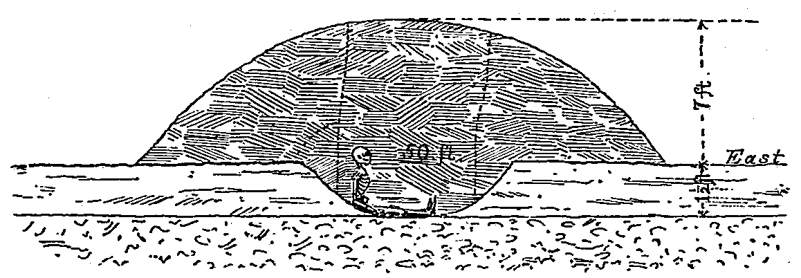 The bottom of this layer corresponded with the original surface of the ground, but the excavation being continued, a circular vault or pit, 6 feet in diameter, was found extending downwards, with perpendicular sides, to the depth of nearly 3 feet. The bottom of this pit was covered to the depth of an inch with fine chocolate-colored dust. Although the filling of this pit was chiefly sand, there was a cavity at the bottom a foot high in the center, over which the sand filling was arched as shown in the figure.[Pg 18]