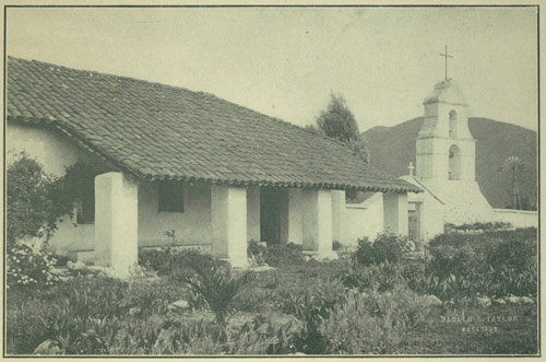 While it is very possible the Mission of San Juan Capistrano—the next one further north—was 12 the most imposing, architecturally, of all the California Missions in its prime, it was not allowed to stand long enough for us to know its glory, the earthquake of 1812 destroying its tower, after which time it remained in ruins. San Luis Rey suffered materially from the hands of the spoilers during the sad epoch of Secularization and when I first saw it, some thirty years ago, nearly all its outbuildings were destroyed. Yet even in its ruined condition it exercised great fascination over all who viewed it, and careful study revealed that, architecturally, it was the most perfect Mission of the whole chain. While not as solidly built as either Santa Barbara, San Carlos at Monterey or San Carlos in the Carmelo Valley, it was architecturally more perfect. Indeed it was the only Mission that combined within itself all the elements of the so-called Mission Style of architecture.