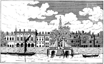 A little farther west, in Beaufort-buildings, Fielding once resided. A contemporary tells how he was once hard put to it to pay the parochial taxes for this house. The tax-collector at last lost patience, and Fielding was compelled to obtain an advance from Jacob Tonson, the famous publisher, whose shop stood upon a portion of the site of Somerset House. He returned home with ten or twelve guineas in his pocket, but meeting at his own door an old college chum who had fallen upon evil times, he emptied his pockets, and was unable to satisfy the tax-gatherer until he had paid a second visit to the kindly and accommodating Tonson. Another of the great Strand palaces stood on this site—Worcester House; which, after being the residence of the Bishops of Carlisle, became the town house of the Earls of Worcester. Almost adjoining stood Salisbury, or Cecil House, which was built by Robert Cecil, first Earl of Salisbury, a son of the sage Lord Burghley, whose town house stood on the opposite side of the Strand. It was pulled down more than two hundred years ago, after a very brief existence, and Cecil and Salisbury streets were built upon its site. Yet another Strand palace, Durham House, the "inn" of the Bishops Palatine of Durham, stood a little nearer to Charing Cross. It was of great antiquity, and was rebuilt as long ago as 1345. Henry VIII. obtained it by exchange, and Queen Elizabeth gave it to Sir Walter Raleigh. The most interesting event that ever took place in the house was the marriage of Lady Jane Grey to Lord Guildford Dudley. Eight weeks later she was proclaimed Queen, to her sorrow. Still nearer to Charing Cross, and upon a portion of the site of Durham House, is the famous bank of the Messrs. Coutts, one of the oldest of the London banks. The original Coutts was a shrewd Scotchman, who, by his wit and enterprise, speedily became rich and famous. He married one of his brother's domestic servants, and of that marriage, which turned out very happily, Lady Burdett-Coutts is a grandchild. Mr. Coutts' second wife was Miss Harriet Mellon, a distinguished actress of her day, to whom he[Pg 11] left the whole of his fortune of £900,000. When the lady, who afterwards became Duchess of St. Albans, died in the year of the Queen's accession, that £900,000 formed the foundation of the great fortune of Miss Angela Burdett, better known to this generation as Lady Burdett-Coutts. Messrs. Coutts' banking-house is an interesting building, with many portraits of the early friends and customers of the house, which included Dr. Johnson and Sir Walter Scott. The cellars of the firm are reputed to be full of boxes containing coronets and patents of nobility. Upon another part of the site of Durham House the brothers Adam built, in 1768, the region called the Adelphi. There, in the centre house of Adelphi-terrace, with its wondrous view up and down the river, died in 1779 David Garrick.