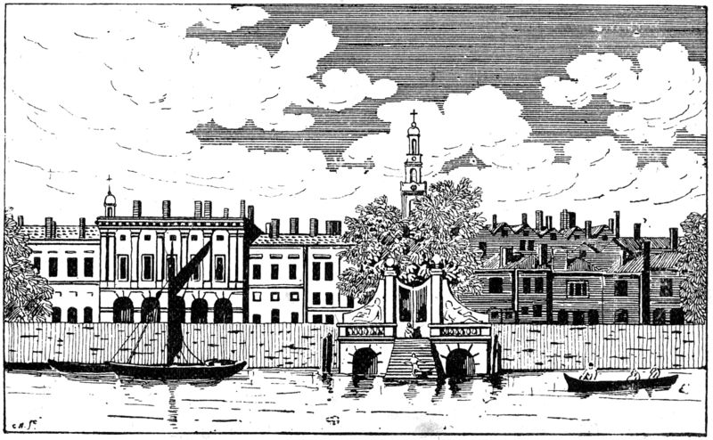 It is hardly necessary to say that the present Somerset House, which is exactly opposite the church of St. Mary-le-Strand, is not the original building of that name. People—praise to their taste!—did not build in that fashion in the time of the Tudors. The old house, built by not the cleanest means, by the Protector Somerset, was "such a palace as had not been seen in England." After Somerset's attainder it became the recognised Dower House of the English Queens. It was built with the materials of churches and other people's houses. John of Padua was the architect, and it was a sumptuous palace indeed; but if Somerset ever lived in it, it was for a very brief space. One of the accusations upon which he was attainted was that he had spent money in building Somerset House, but had allowed the King's soldiers to go unpaid. It was close to the Water Gate of Somerset House that the mysterious murder of Sir Edmundbury Godfrey took place in 1678. The story of the murder is so doubtful and complicated that it is impossible to enter upon it here. Sir Edmundbury was induced to go to the spot where he was strangled under the pretence that, as a justice of the peace, he could stop a quarrel that was going on. Titus Oates, the most finished scoundrel ever born on British soil,[Pg 10] suggested that the Jesuits and even Queen Henrietta Maria were concerned in instigating the murder, and three men were hung at Tyburn for their supposed share in it. Around the Somerset House of that day there were extensive gardens of that square formal fashion which, although pleasing enough to the antiquary, are anathema to the artistic eye. Old Somerset House was demolished in the early days of George III., and the present building, of which Sir Wm. Chambers was the architect, was commenced in 1776.